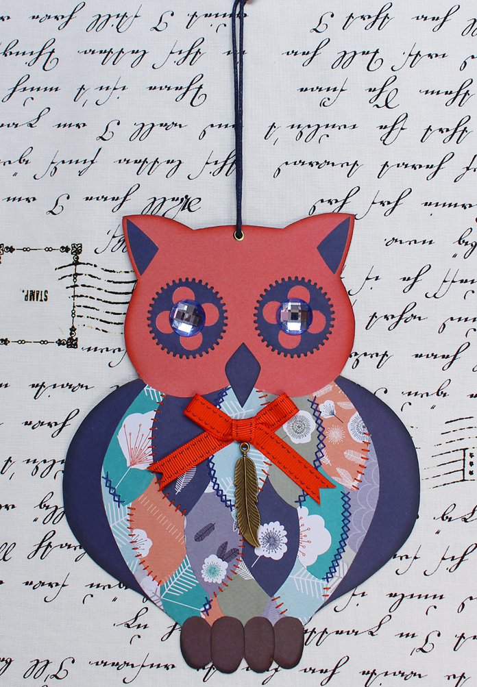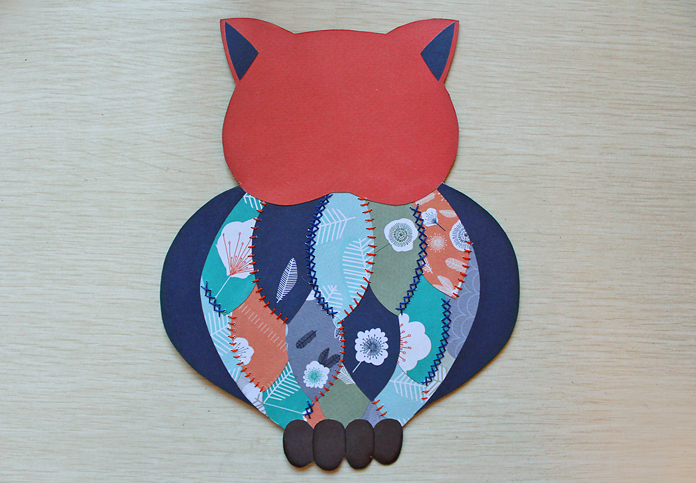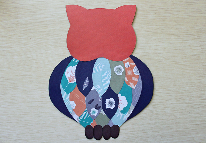 2. Из набора бумаги Owl Folk вырезаем элементы разных цветов, следуя разметке. Клеим элементы в следующем порядке: перья (начиная с нижних), крылья, лапы, голова. Лапы тонируем штемпельной подушечкой.