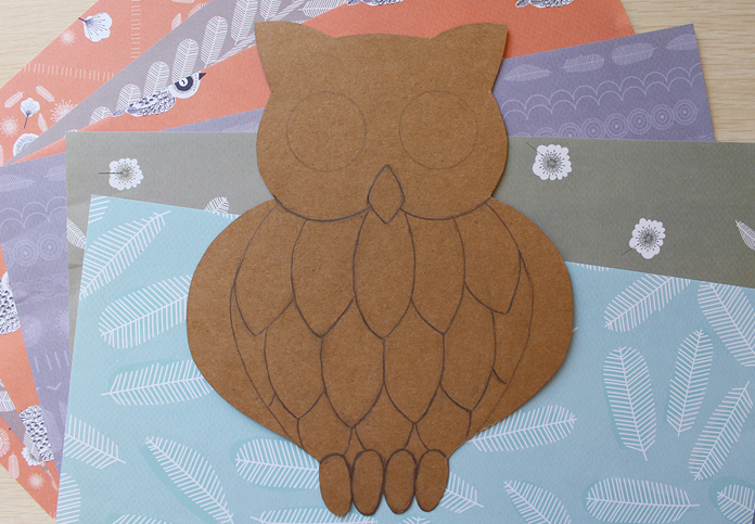 1. Из крафт бумаги вырезаем сову и простым карандашом делаем разметку для перьев, лапок, глаз, клюва и крыльев.