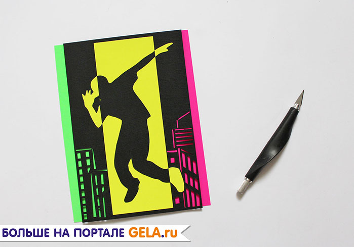 Шаг 3. Приклеиваем прямоугольник с размерами 7х20 см к черной основе (посередине) и сверху приклеиваем силуэт. Вырезаем из неонового картона части тела танцора, которые выходят за цветную рамку.
