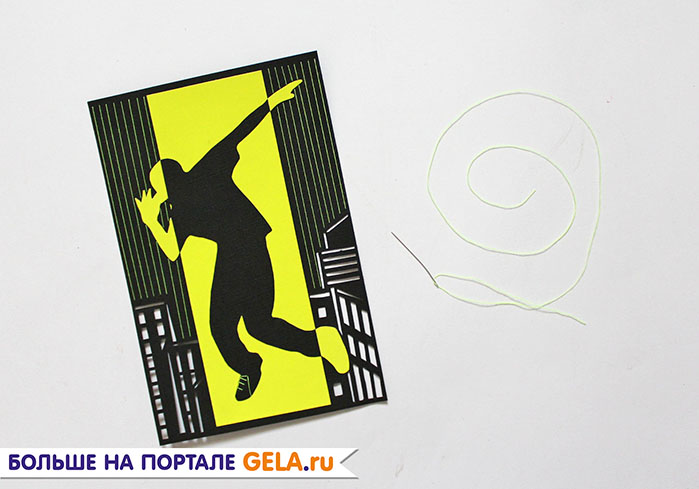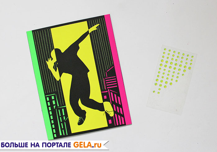 Шаг 7. Приклеиваем к основе открытки 2 одинаковых по размеру неоновых листа, далее прошитую часть с танцором. Добавляем немного блеска, декорируя открытку клеевыми неоновыми точками.