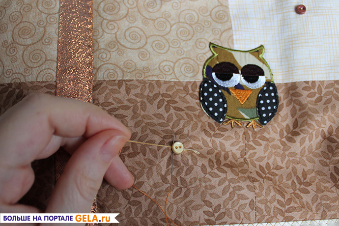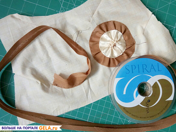 25. Глазки совы можно также сделать из косой бейки! Для этого на размеченном месте глаз по краю ручной наметкой зафиксируйте косую бейку с одного края. По другому краю стяните бейку к центру. Проложите машинную строчку по наметке.