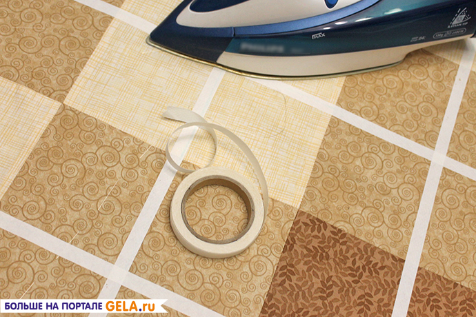 8. Снимите бумажную основу (клеевой слой должен остаться на ткани), наложите косые бейки и аккуратно прогладьте утюгом, зафиксировав их на ткани.