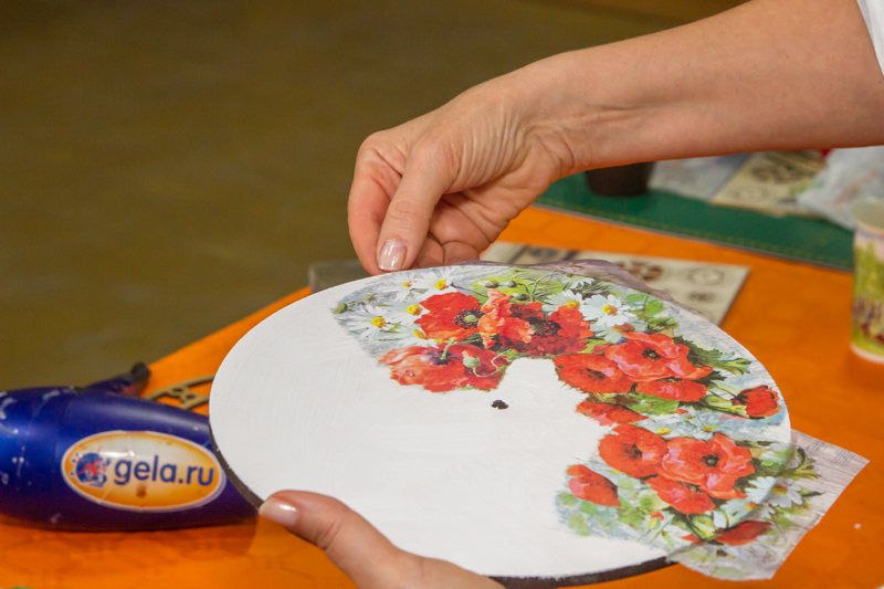 5. Приклеиваем рисовую карту к основе. Рисовая карта имеет тонкую, полупрозрачную фактуру, потому клеим (наносим клей) ее на основу поверх изображения.