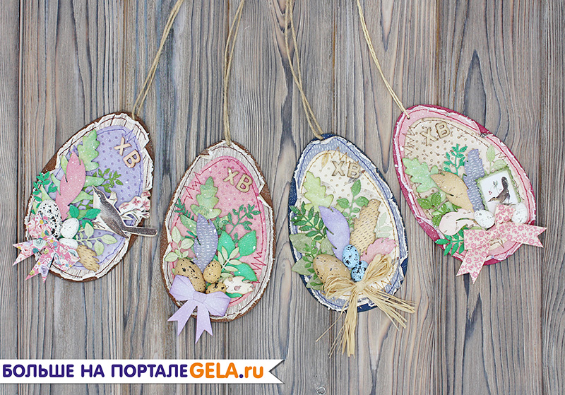 Из набора цветного картона выбираем лист коричневого цвета для основы и с помощью ножа и вырубной машинки вырезаем самое большое яйцо. Из набора бумаги WillsonWoodвыбираем лист с рисунком древесной коры и таким же образом вырезаем самое большое яйцо. Из н