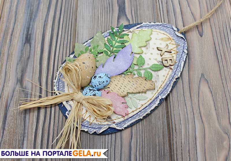 Клеим к открытке пенопластовые перепелиные яйца, разрезанные пополам (яйца можно приобрести готовые, а можно покрасить самим, используя белые пенопластовые яйца, грунт основу и акриловые краски). Клеим затонированный по краям штемпельной подушечкой бантик