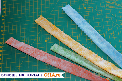 2. Нарежьте по 6 полос каждого цвета ткани. Цвета ткани должны сочетаться с цветом рисунка на ленте. Итого должно получиться 24 ленты.