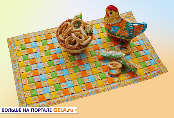 9. Закрепите работу булавками на мате и прокладывая горизонтальные полосы из жаккардовых лент сплетите салфетку. Следите за тем, чтобы работу не перекашивало. По окончании плетения, вручную наметочными стежками пришейте бордюры из лент с лицевой и изнаночной стороны. Стачайте бордюры на швейной машине, удалите наметку.