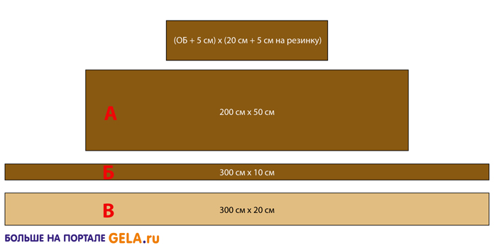 1. Перед началом работы постирайте ткань, потому что при термообработке она может дать усадку. Вам понадобится 2 мерки: обхват бедер (ОБ) и длина юбки (ДЮ). ОБ измеряется по самому выступающему месту бедер, ДЮ измеряется с боку от талии. Из ткани №1 вырезаем кокетку длиной 25 см, шириной ОБ + 5 см. Далее один волан (А) длиной 50 см, шириной 2 м. Второй волан (Б) длиной 10 см, шириной 3 м. Все расчеты даны без учета припусков.