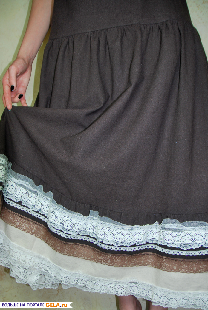 6. А теперь начинаем украшать нашу юбку изящным кружевом LAKIDAIN! Используем три вида кружева разной ширины и цвета. На край волана (Б) нашиваем 3 ряда кружева (см. фото). Причем коричневое кружево пришиваем на нижний край волана, закрывая оверлочный шов.