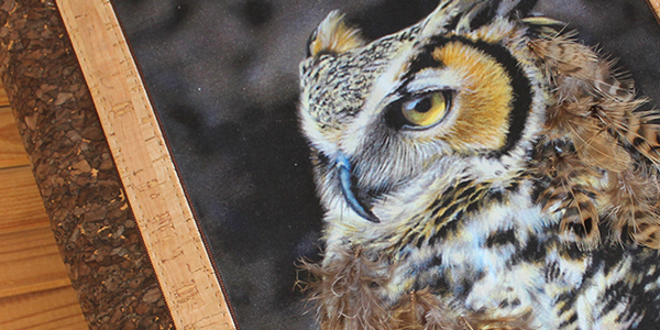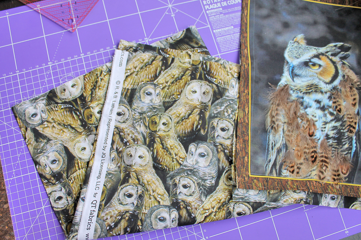 1. Для работы вырезаем из пробковой ткани два куска размером 35 х 70 см. Выбираем большой принт с совой.
