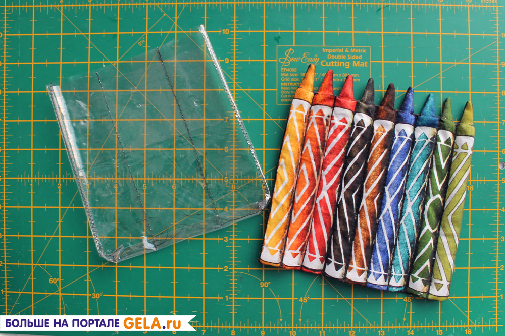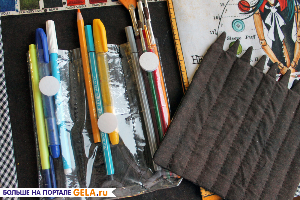 16. Из пленки ПВХ шьем карман-органайзер для хранения карандашей и кистей. Делаем два- три отделения.