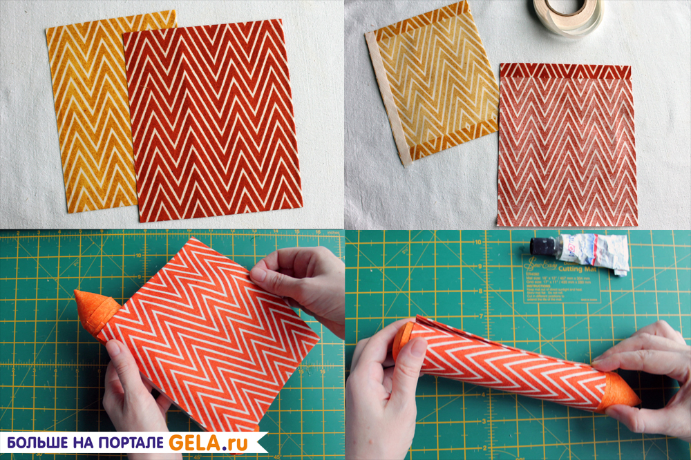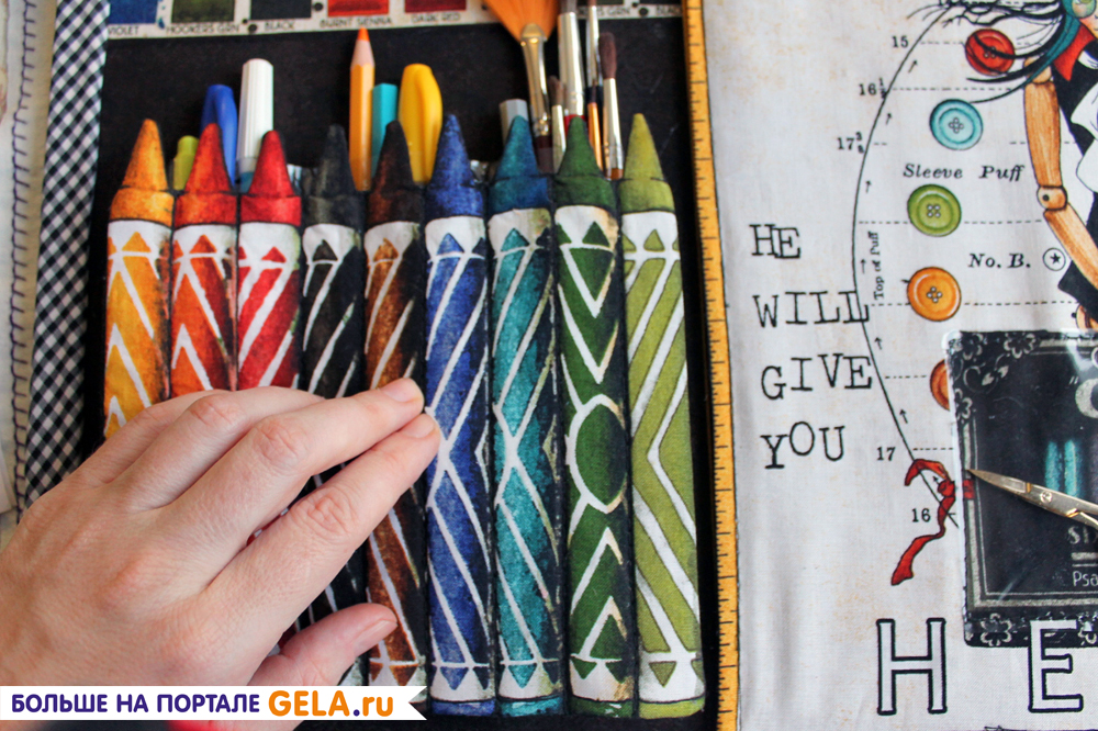 28. Яркой тканью из коллекции QUILTING TREASURES "Зарисовки" оклеиваем поверхность тубуса, имитируя этикетку воскового карандаша.