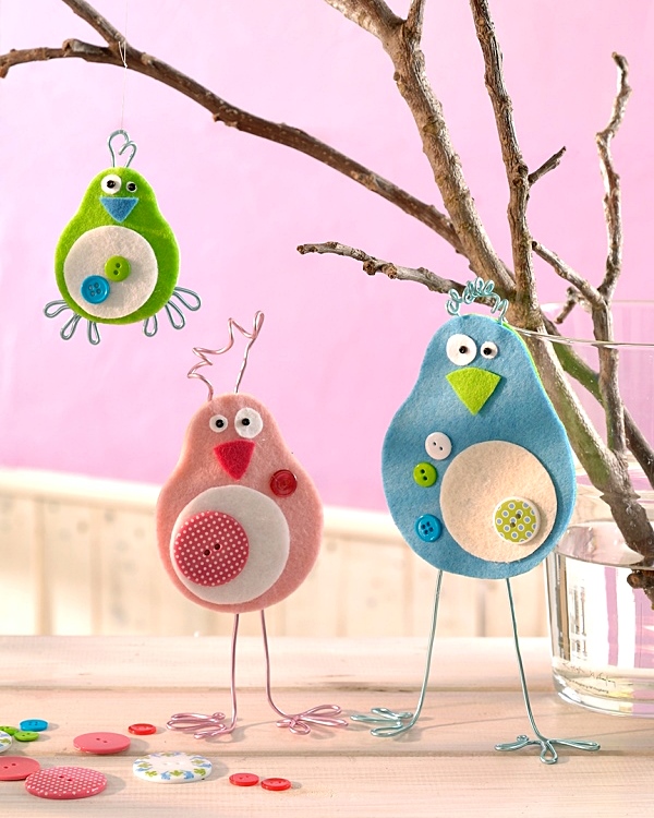 2. В дополнение из фетра вырежьте круглые детали животика и глазок. Клювик - треугольник с полукруглым основанием. Расположие мелкие детали на основании туловища и зафиксируйте клеем. Для глазок используйте деревянный бисер. Подберите пуговички в тон к используемым цветам фетра и наклейте горячим пистолетом к основе.