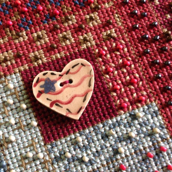 Шаг 4. На центральный красный квадрат пришейте керамическую пуговицу, входящую в состав набора.