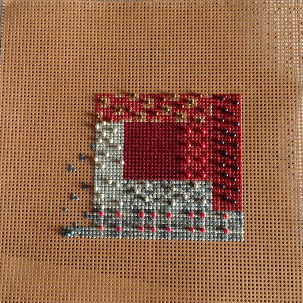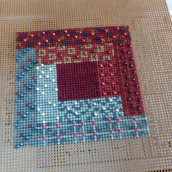 Шаг 2. Вышиваем центральный квадрат. Затем вышиваем поочередно «бревнышки» избы. Рекомендуем вышить сначала элементы стежком «Счетный крест», затем элементы с пришиванием бисера. (фото №2-5)