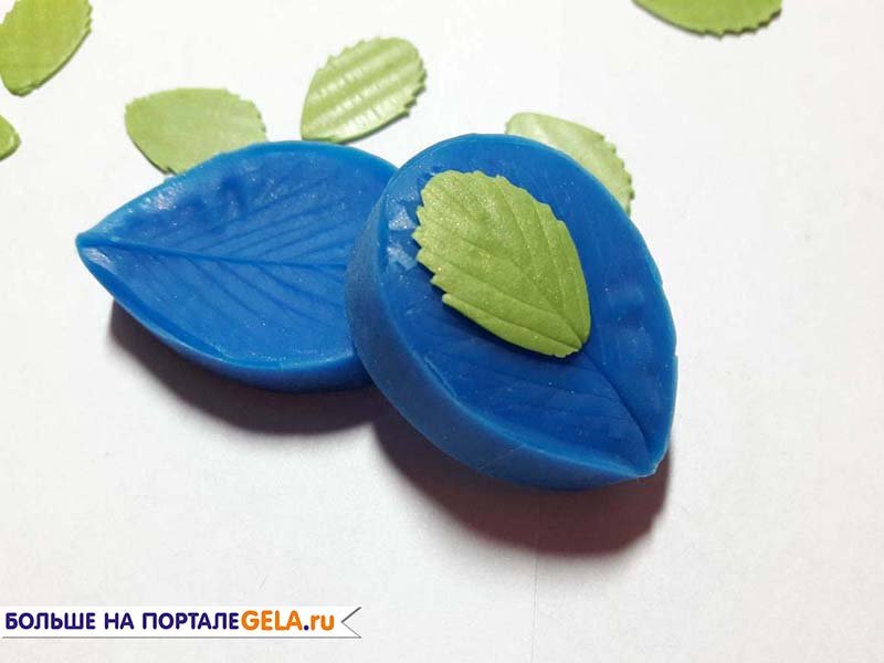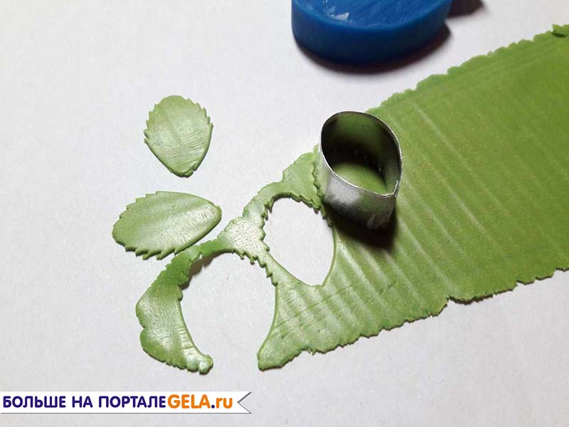 Глину оливкового и глину жемчужно-зеленого цвета смешиваем в соотношении примерно 1:5, чтобы цвет листьев был приглушенным и похожим на натуральный. Раскатываем пласт примерно 0,5-0,7 мм толщиной и с помощью каттера для листа земляники вырезаем листья.