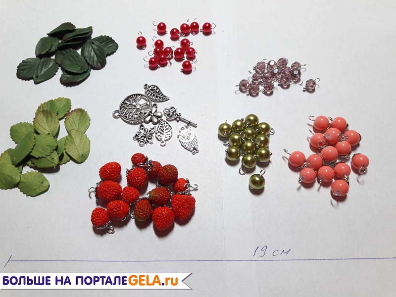 Сборку начинаем с ягод (на их количество будем ориентироваться в дальнейшем). В данном случае их 13 шт., пропорционально распределяем их относительно количества звеньев в цепочке (в данном случае 19 см).