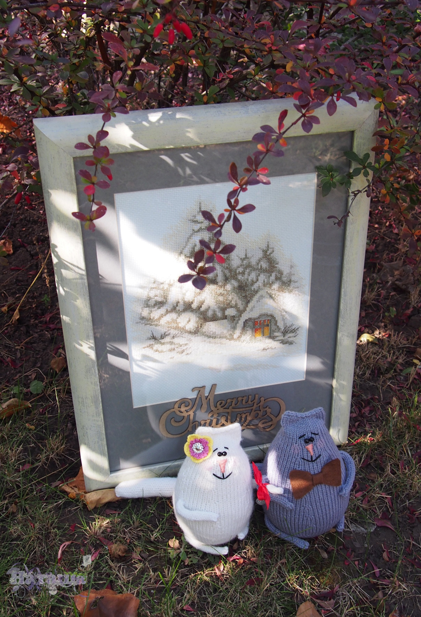 Работу вышивала быстро и непринужденно. Затем оформляла в багетной мастерской, но с моей подсказкой — принесла вырубную надпись «Merry Christmas», которая удачно вписалась в общее оформление.